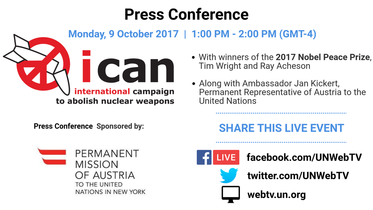 Join 2017 @NobelPrize for Peace winners @TimMilesWright @achesonray @nuclearban at presser sponsored by @AustriaUN