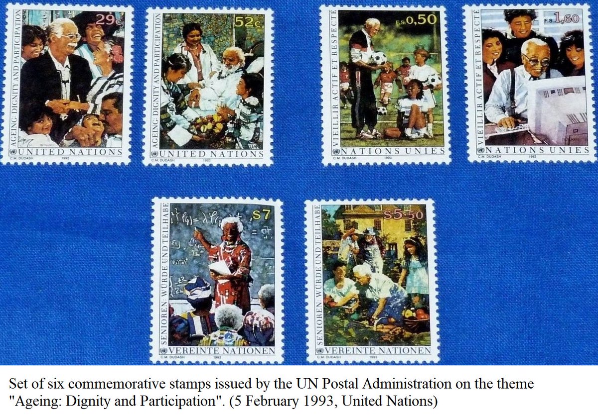 #OTD in 1993, the UN Postal Administration issued 6 #stamps on the theme "Ageing: Dignity & Participation" https://bit.ly/2DSv8gb . #UNGA commended the action as part of UN efforts to implement the 1982 Int'l Plan of Action on #Ageing https://bit.ly/2S6HaLD @UNDESA @UNstampspic.twitter.com/XrcvhMtzJf