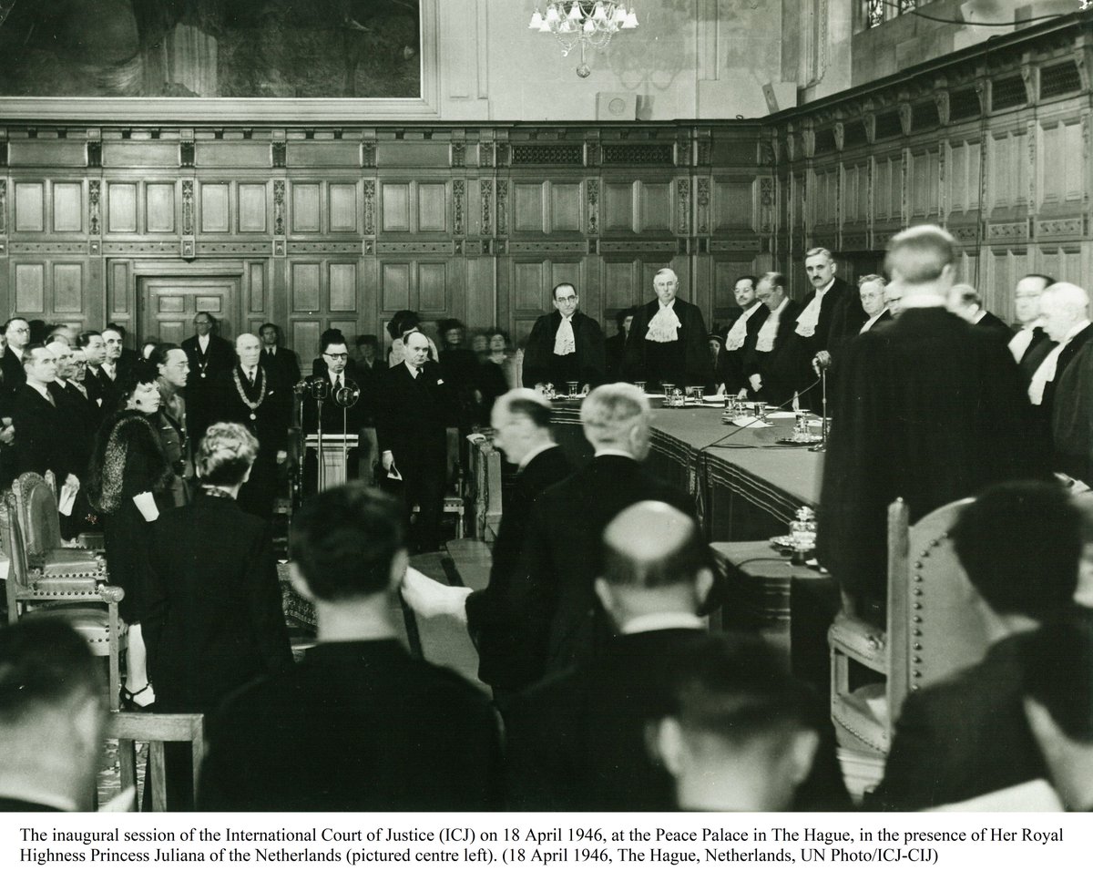 #OTD in 1946, the Int'l Court of Justice - the UN's principal judicial body - held its official inaugural sitting in the Great Hall of Justice in the @PeacePalace of #TheHague. Read more from the @UNYearbook's coverage of the Court's establishment https://bit.ly/2FjTsKo  @CIJ_ICJpic.twitter.com/yVrqVnx8MB