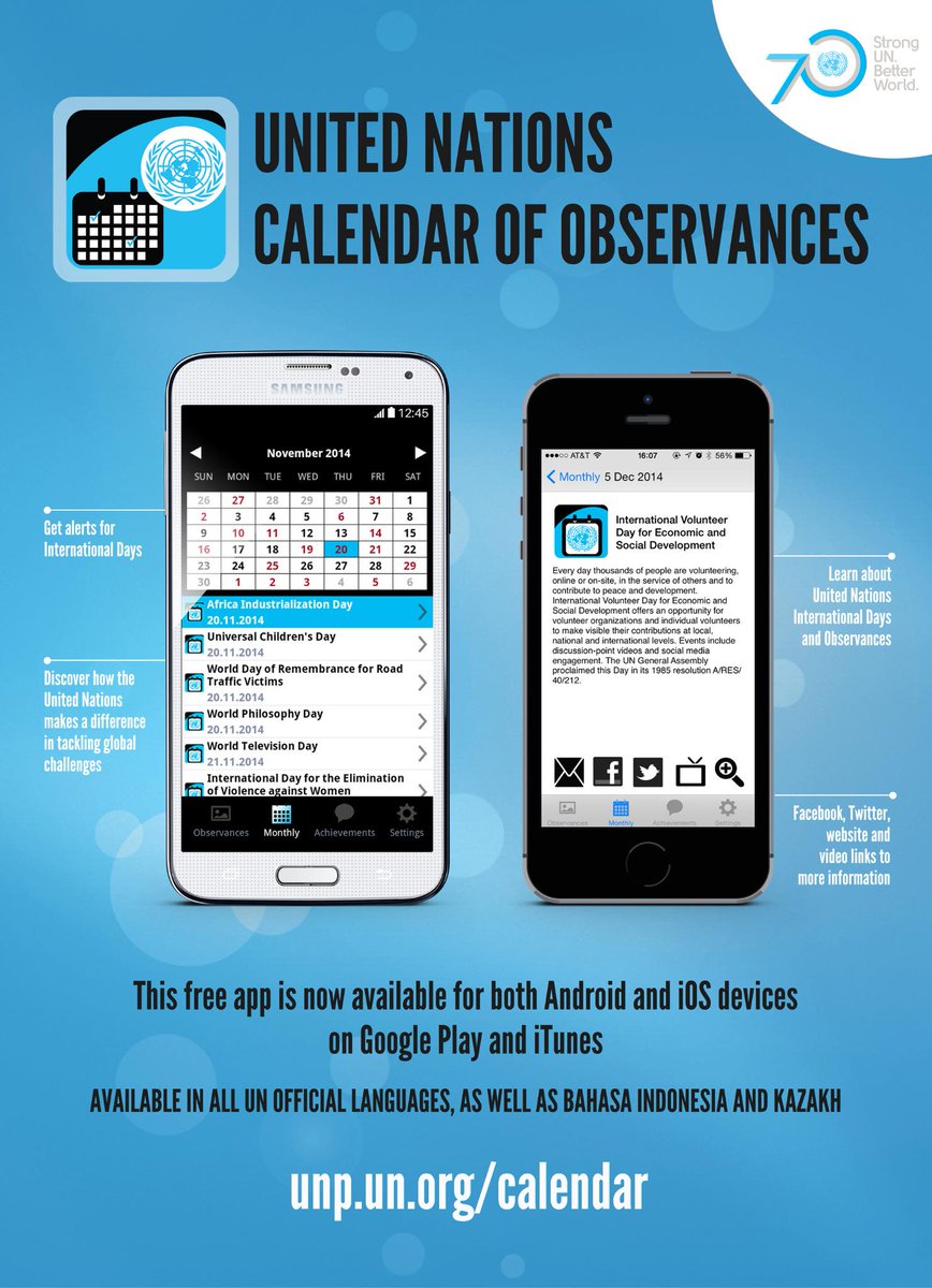 Now available! The 2015 @UN Calendar of Observances app. Download free for iOS & Android: http://ow.ly/FODvU pic.twitter.com/ssKlmUKifB