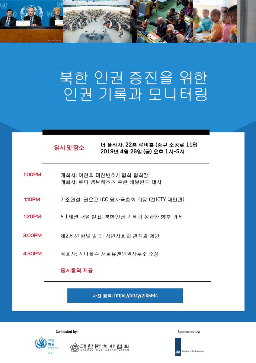 오는 26일 금요일 유엔인권사무소와 #대한변호사협회는 #조선민주주의인민공화국 #인권 기록과 모니터링에 대한 워크샵을 공동개최합니다. 등록: https://bit.ly/2Ik59l4