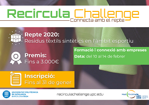 #RecirculaChallenge2020 de@la_UPC? Fins al 31 de gener! https://buff.ly/2NwdbYX Així podeu apuntar-vos ja a la trobada i dinar amb empreses del 10/feb i a la formació del 10-14/feb. https://buff.ly/2FYnGQO#RecirculaChallenge#EEBE@EEBE_UPCpic.twitter.com/HEA28C6bQ9