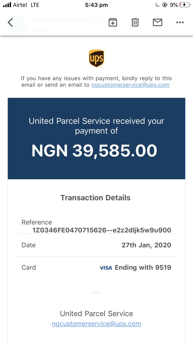 My goods arrived NIGERIA on Friday, on Monday UPS sent me a mail asking me to pay both administrative and custom charges which I have paid, up till now I still can’t get hold of my goods, today I received another mail asking me to pay 835,039 for custom duty again, pls look intopic.twitter.com/bWeqEQHFLJ