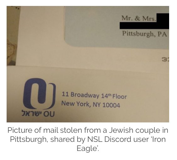 The leaked NSL Discord chats show the group’s intentions to target Jews. In July 2018, ‘Iron Eagle’ of NSL shared pics and bragged about stealing mail and an Israeli flag from a Jewish residence in Pittsburgh. https://unicornriot.ninja/2018/neo-nazi-splinter-group-chats-shows-a-fractured-violent-movement/ …pic.twitter.com/puFWat7blG