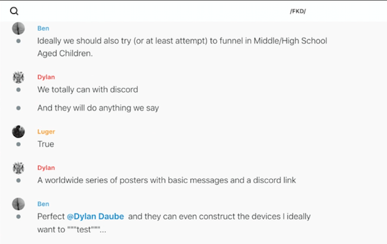 Conor Climo used the alias 'Ben' / 'Ben Dover' in the Feuerkreig Division's encrypted Wire chat. In addition to discussing various terror tactics, he proposed using Discord chats to recruit teenagers who he could then direct to make improvised bombs. https://unicornriot.ninja/2020/leaked-neo-nazi-terrorist-feuerkreig-division-organizing-chats/ …pic.twitter.com/D04o10ES0N