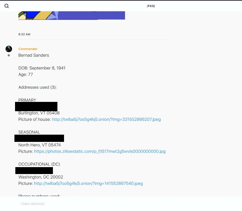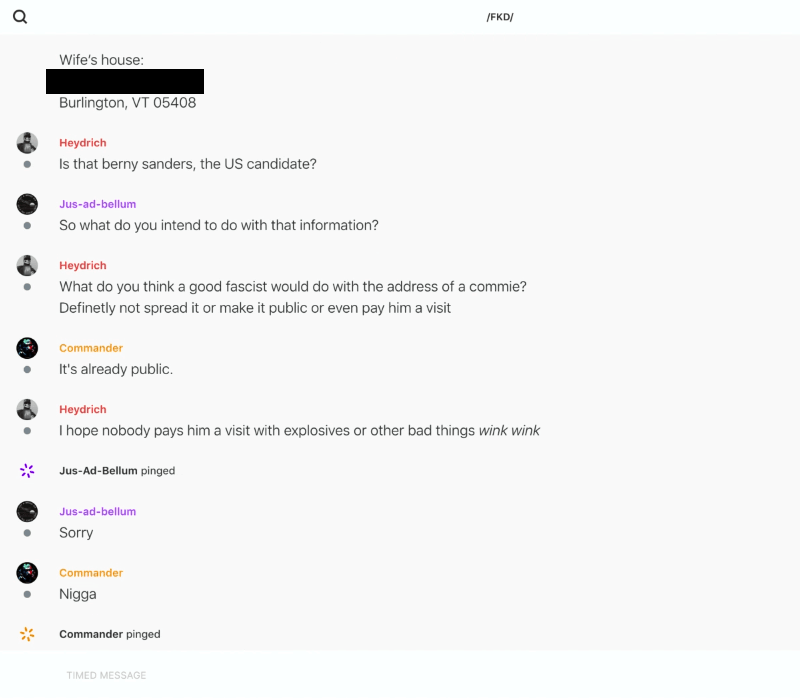 In late July 2019, 'Commander' shared Bernie Sanders' home addresses in the Feuerkreig Division's Wire chat; other members discussed wanting to see Sanders get bombed. It's not clear if any material attack plans were made or if this was just chatter. https://unicornriot.ninja/2020/leaked-neo-nazi-terrorist-feuerkreig-division-organizing-chats/ …pic.twitter.com/0fsRBtKx3F