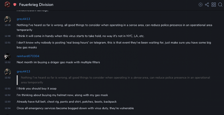 The Feuerkrieg Division discussed a desire to exploit the coronavirus. Members were encouraged to spread #COVIDー19 to Jews and people of color. They also outlined using bomb threats to slow already burdened emergency response in potential attack areas: https://unicornriot.ninja/2020/leaked-neo-nazi-terrorist-feuerkreig-division-organizing-chats/ …pic.twitter.com/6W8CA5uXks