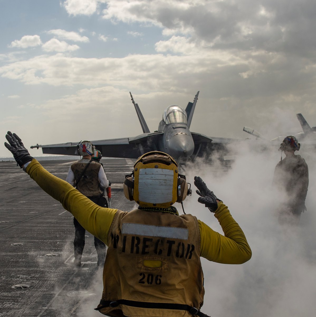 A Sailor directs an F/A-18 on the aircraft carrier USS Nimitz (CVN 68). Our maritime security mission does not stop. Operating at the peak of efficiency & readiness at sea - even as our world faces a global pandemic - they remain vigilant & on station.pic.twitter.com/v1XU3z0uCZ