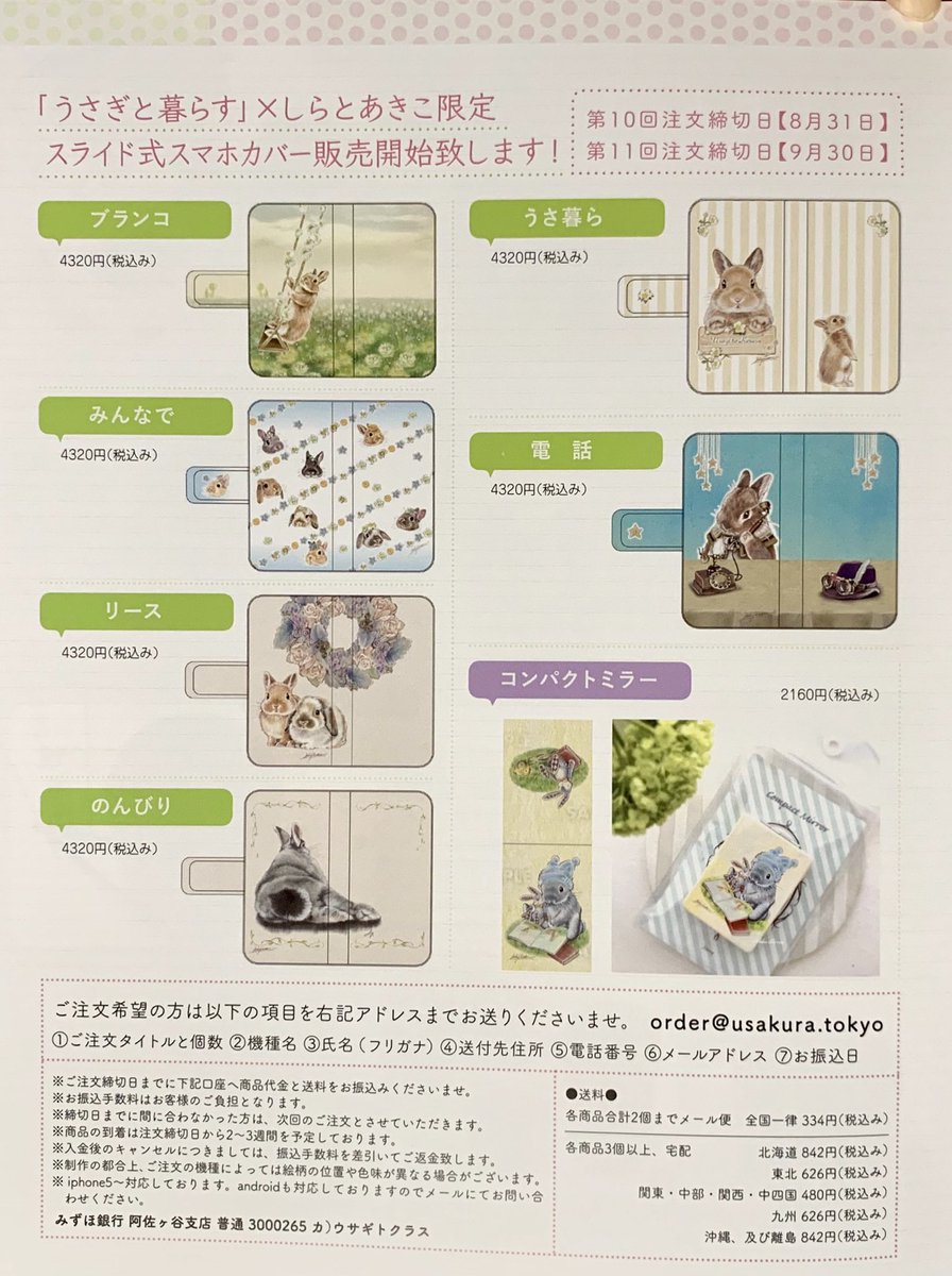 また、「うさぎと暮らす×しらとあきこ限定スライド式スマホカバー」の次回ご注文締め切りは8/31です。どうぞよろしくお願いいたします(*^^*)