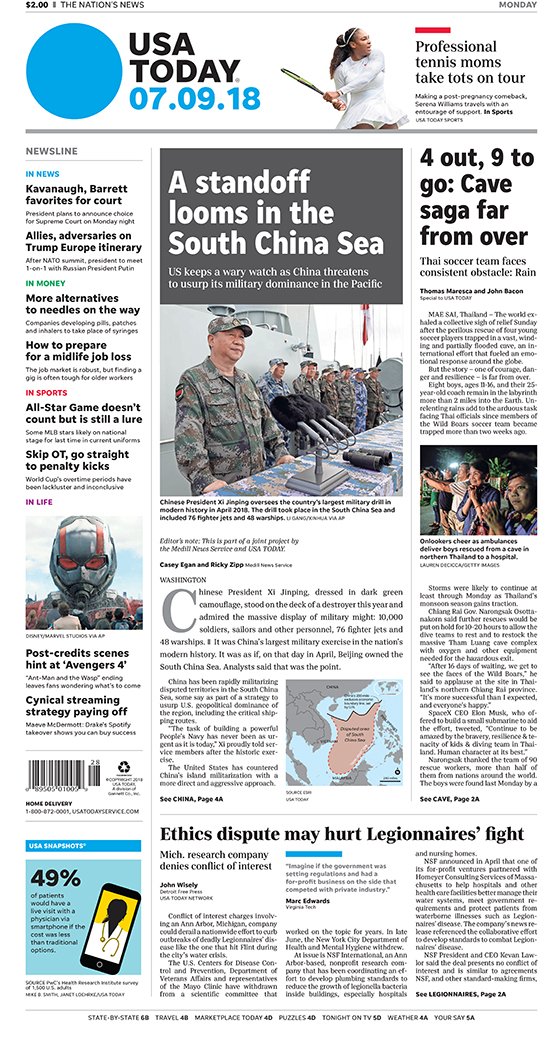 On today's #frontpage: US keeps a wary watch as China threatens to usurp its military dominance in the Pacific; First members of Thai soccer team escape cave but saga is far from overpic.twitter.com/8a18Y4878d