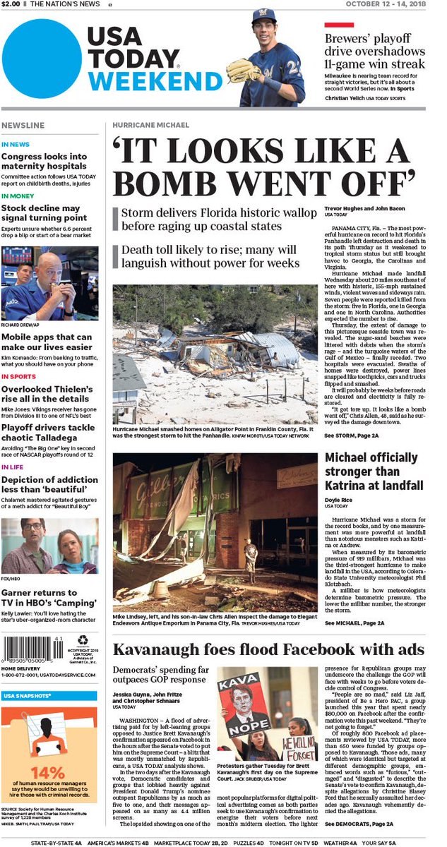 On today's #frontpage: Officials expect to see death toll from Michael rise; "Furious" Democrats purchase blitz of Facebook ads on Kavanaugh, far outpacing GOP spendingpic.twitter.com/vkuk8wvsrU