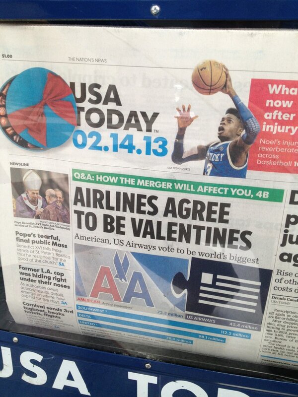 High-5 for @USATODAY's headline on @AmericanAir & @USAirways merger. #VDayLovepic.twitter.com/yM0LFEOi