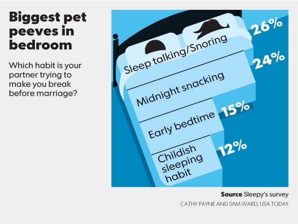 RT@USATODAY Biggest pet peeves in the bedroom? Sleep talking and snoring take first place #snapshotspic.twitter.com/JWrlhVeng0