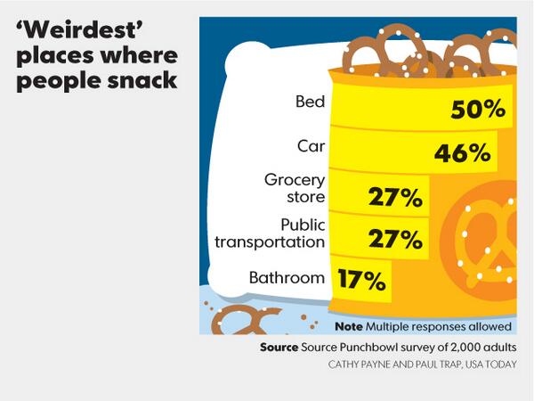 @USATODAY Those aren't exactly "weird" places to snack. "In a mortuary" would be a weird place to snack, "in bed" certainly isn't