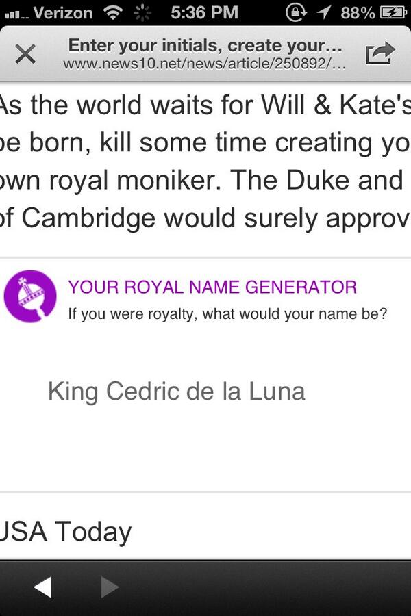 @USATODAY: Enter your initials and create your own royal name: http://usat.ly/1bacxZQ ” Fun!Thanks. Twitter will use this to make your timeline better. UndoUndo