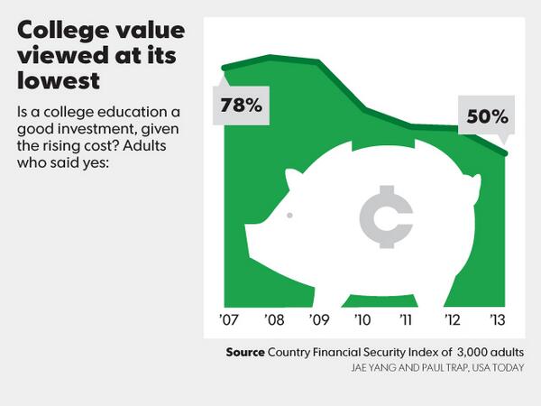 @USATODAY: Only half say a college degree is a good investment; lowest level in 7 years#snapshots pic.twitter.com/UOiuU6HVCS”@cspanwj