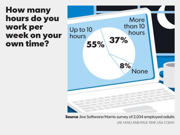 “@USATODAY: 55% of surveyed employed adults spend up to 10 hours working per week on their own time. #snapshots pic.twitter.com/ER0wH878JP”