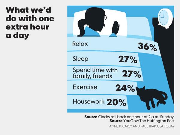 Apa yg kita lakukan dgn waktu ekstra 1 jam?..RT"@USATODAY: What would you do with an extra hour each day?#snapshots pic.twitter.com/NjcxiZuiq3”