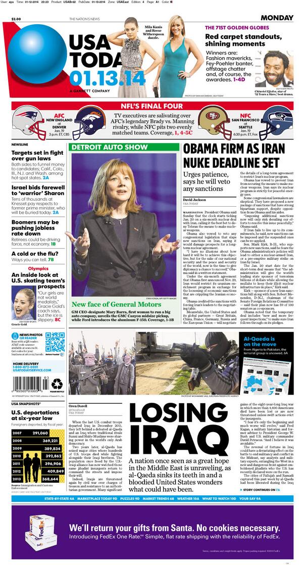 In Monday's paper: Recap of #GoldenGlobes. Obama firm as Iran nuke deal set. #NFL final four. Auto show coverage.pic.twitter.com/nmih4svhPn