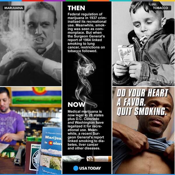 @USATODAY: Taking a look at how times have changed for smoking, both pot and cigarettes: http://usat.ly/1hJwFCj pic.twitter.com/3Ufoz6Io4w”