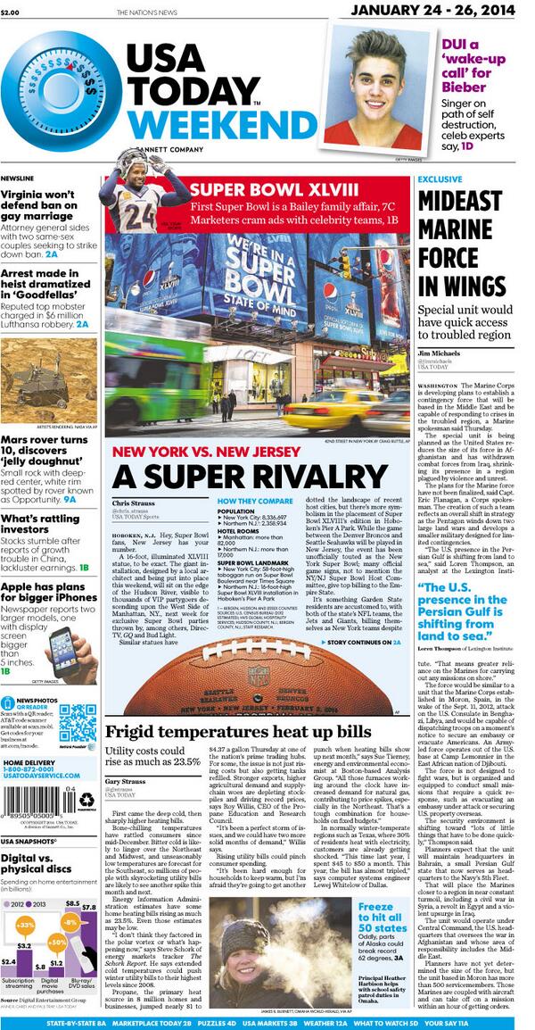 @USATODAY:#SneakPeek at today's paper: ....SuperBowl bragging rights: NY vs NJ. pic.twitter.com/lulxNkRESu”