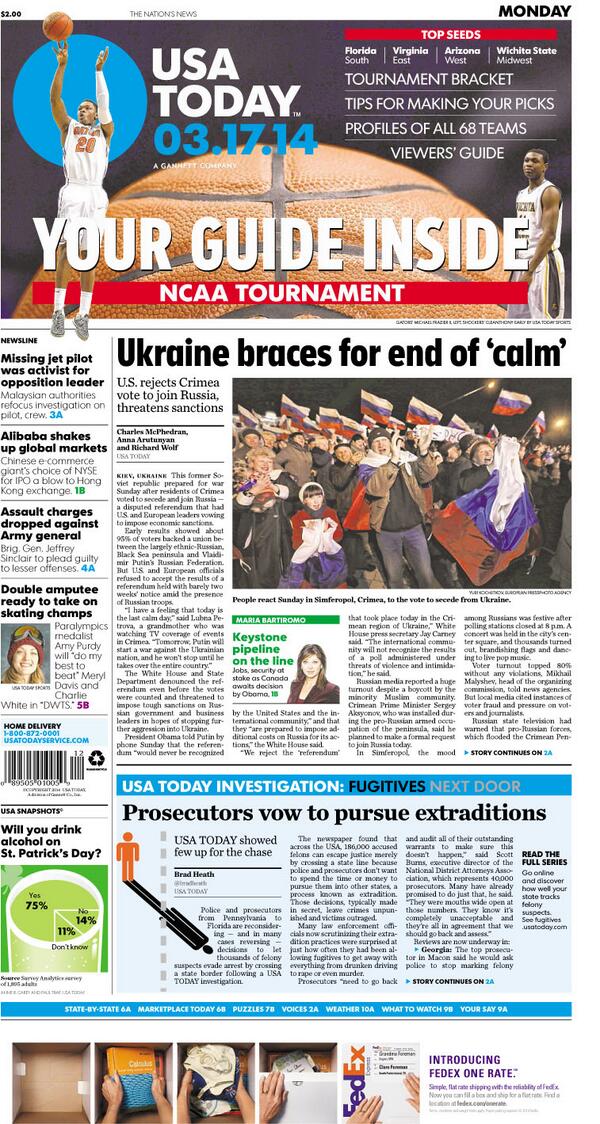 “@USATODAY: In today's newspaper: Bonus #NCAA tournament section. U.S. won't recognize #Crimea vote to join Russia. pic.twitter.com/l8kcUPalAu”