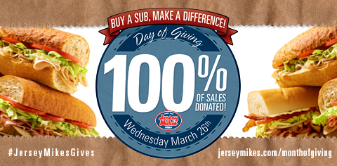 @USATODAY Jersey Mike's Day of Giving! 100% of sales will go to local charities nationwide today#JerseyMikesGivespic.twitter.com/9SUfdPN5nr