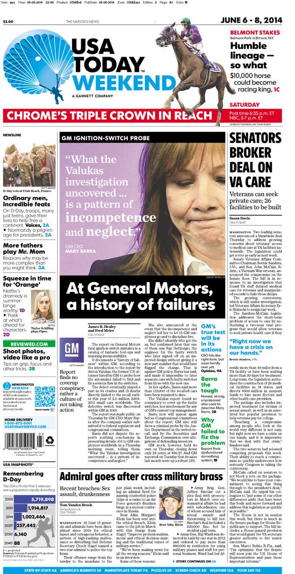 @USATODAY: A look at today's#frontpage: "Incompetence and neglect" at GM. Deal to fix veterans health care. pic.twitter.com/UoLZHFICmZ” MT