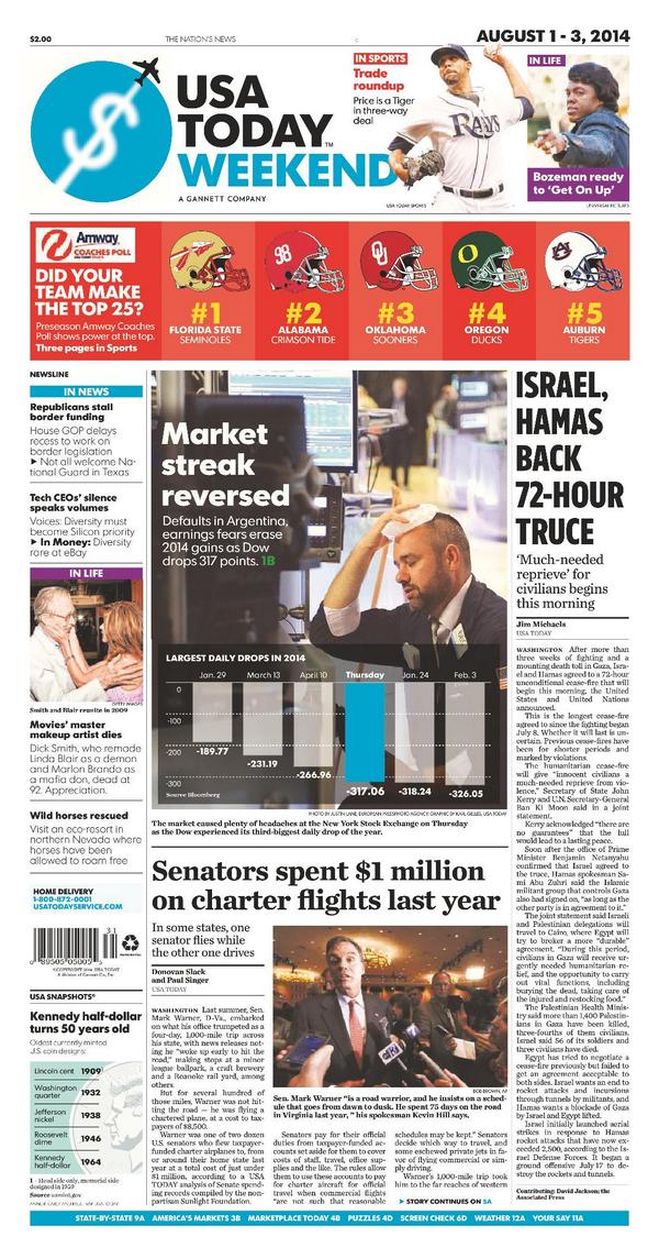 #SneakPeek at Friday's paper: 72-hour truce in #Gaza. Argentina #default tanks #Dow. #Senators drop $1M on flights.pic.twitter.com/043NeW4IKv