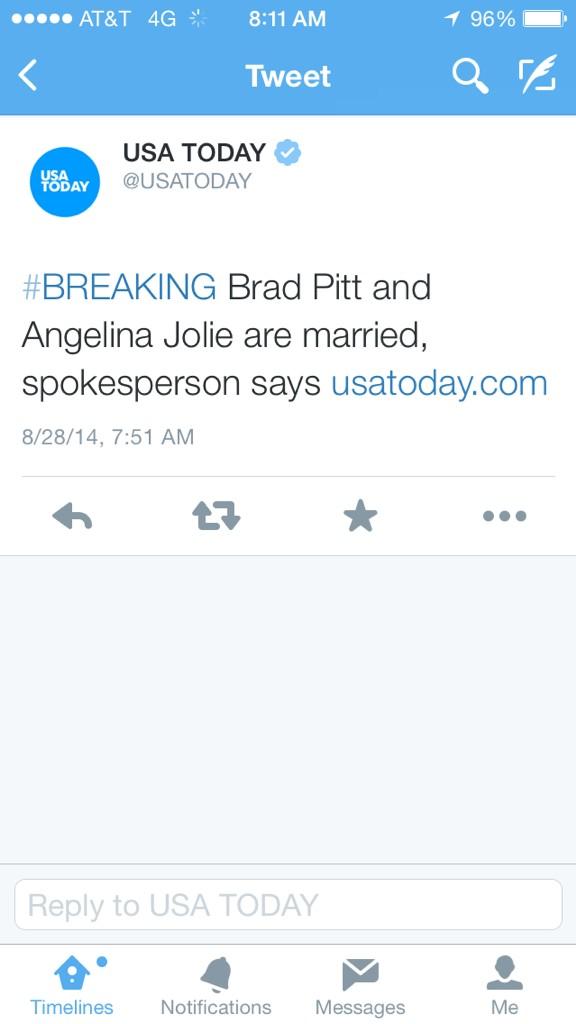 “@USATODAY: #BREAKING Brad Pitt and Angelina Jolie are married, spokesperson says http://usatoday.com ”