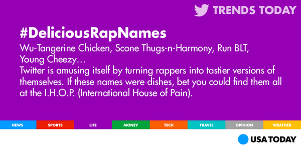 @midnight#hashtagwars ? “@USATODAY: Rappers, menu items or#DeliciousRapNames?#nomnomnom pic.twitter.com/yGgoHil627”