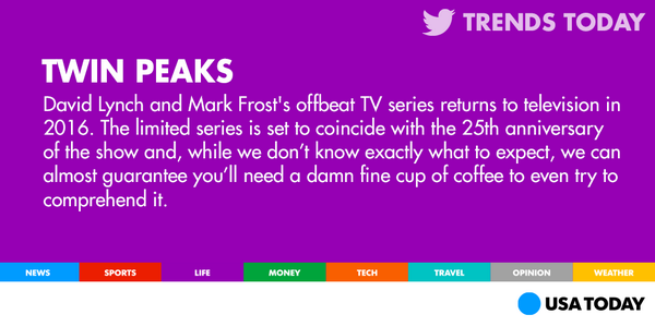 @USATODAY: Get a coffee, grab some pie: "Twin Peaks" is coming back: http://usat.ly/1vIXXy8 pic.twitter.com/2DEV4An5vq”#geekingout#finally