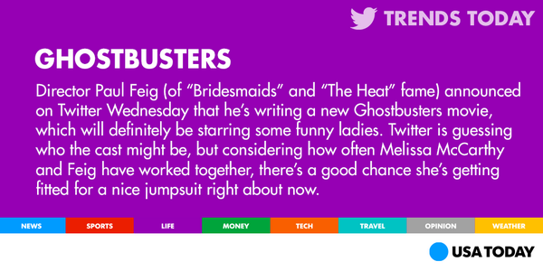 @USATODAY: Who you gonna call? A lady, apparently. "Ghostbusters" is coming back with a female cast: http://usat.ly/1yQbRo7Thanks. Twitter will use this to make your timeline better. UndoUndo
