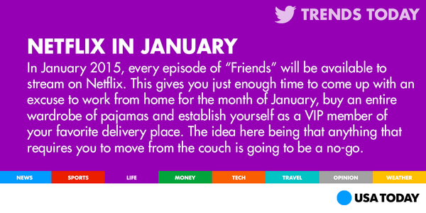 “@USATODAY: The entire run of "Friends" is coming to Netflix in January: http://usat.ly/1sTlnmq pic.twitter.com/CmdTpxORnD” @JIMMYUSH