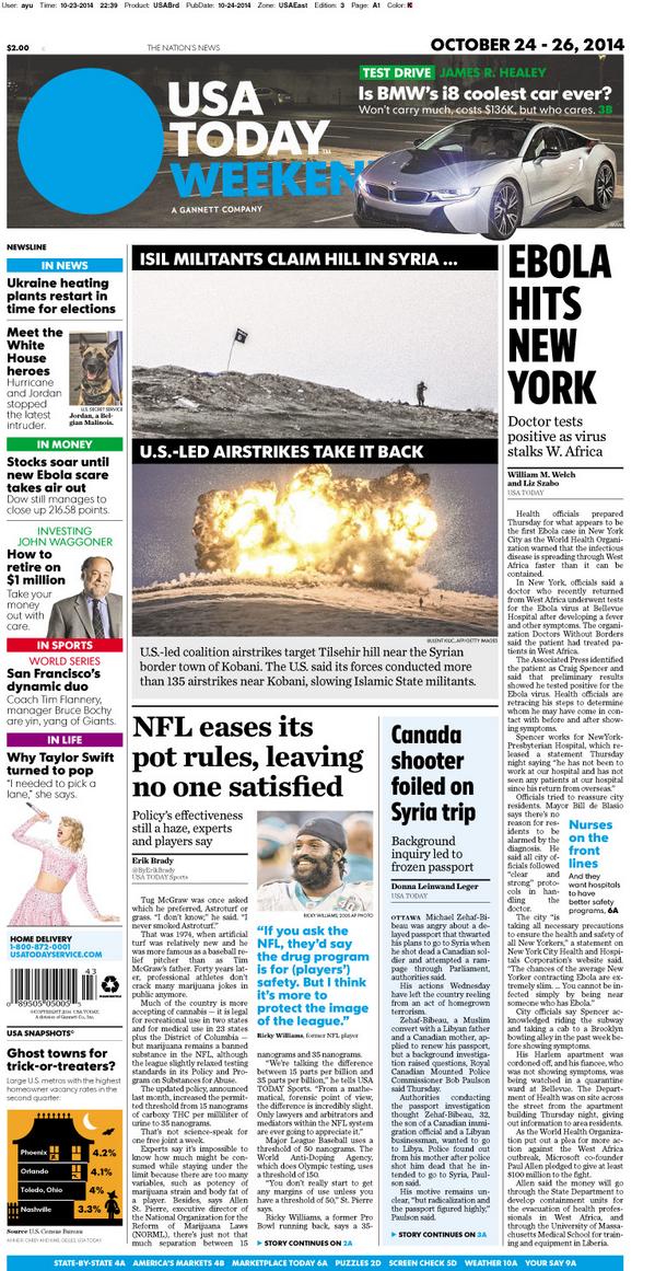 On today's #frontpage: #NYC sees first #Ebola case. Canadian shooter wanted to go to #Syria. #NFL eases pot rules.pic.twitter.com/9ncG3IeS0M