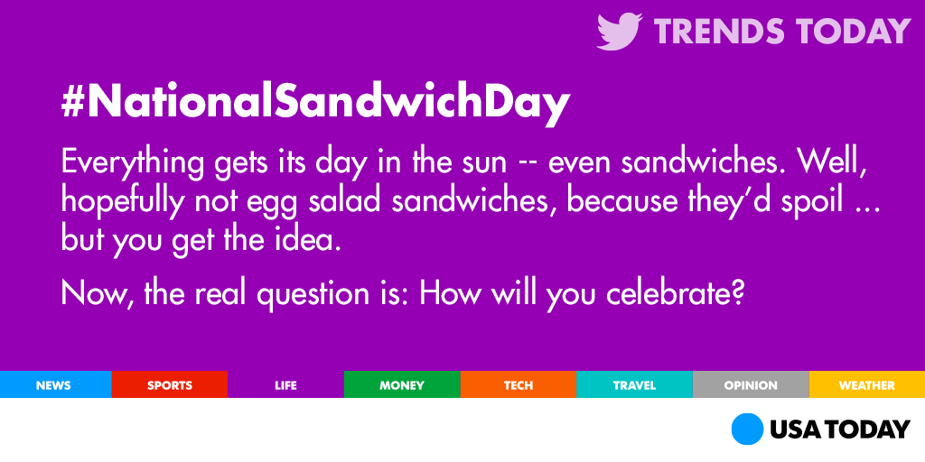 “@USATODAY: It’s #NationalSandwichDay. What's on your plate? pic.twitter.com/7CV3KPzYTD” @tomousecoulson