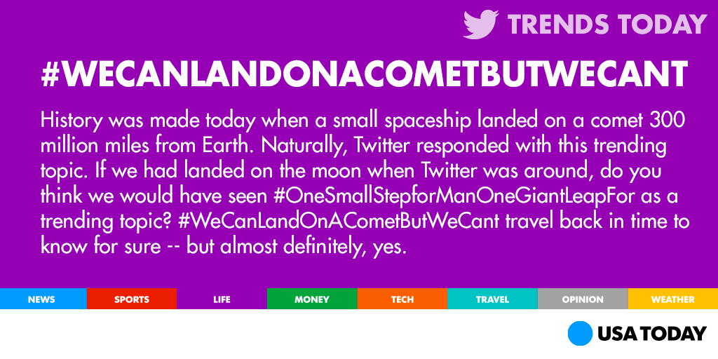 @USATODAY:#WeCanLandOnACometButWeCant resist the urge to immediately make it a trending hashtag on Twitter. pic.twitter.com/D0EHsPpJZt”