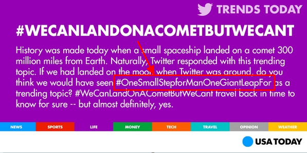 #WeCanLandOnACometButWeCant get@USATODAY to use hashtag with the correct quote:#OneSmallStepforAManOneGiantLeapForpic.twitter.com/XjZCc9rYz3