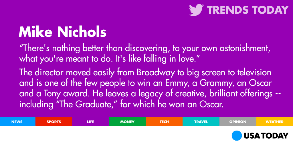 Mike Nichols' gift for finding the link between comic and tragic made him an enduring figure. http://usat.ly/1uf2PbN pic.twitter.com/NaB19Fm2I4