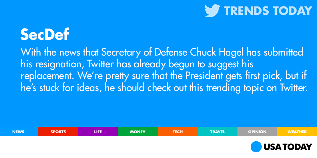 With news that #Hagel is leaving office, Twitter politicos are offering their pick for SecDef. http://usat.ly/1rjVdFb pic.twitter.com/lK6xS6uZmo