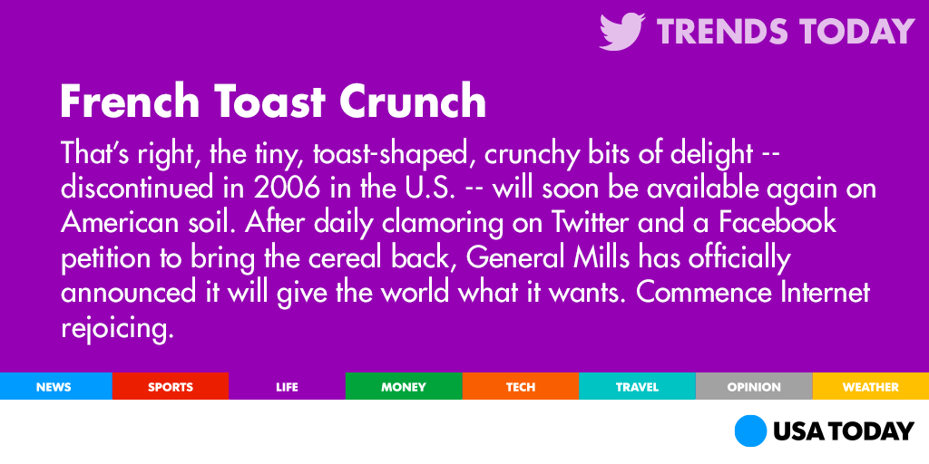 .@USATODAY Happy that the addicting deliciousness is back! "French Toast Crunch Returning After 2006 Discontinuation..."