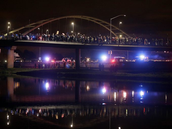 Protesters line up on the University Avenue overpass during #BerkeleyProtests: http://usat.ly/1A9r1kS  (Jeff Chiu, AP)pic.twitter.com/PTOIO5jdNI