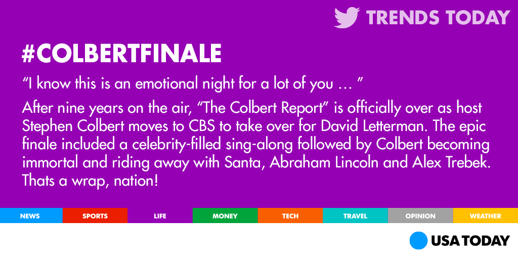 What would bring together the Grim Reaper, Alex Trebek and Big Bird? The #ColbertFinale. http://usat.ly/1C9rrMk pic.twitter.com/PUKLA1noXZ