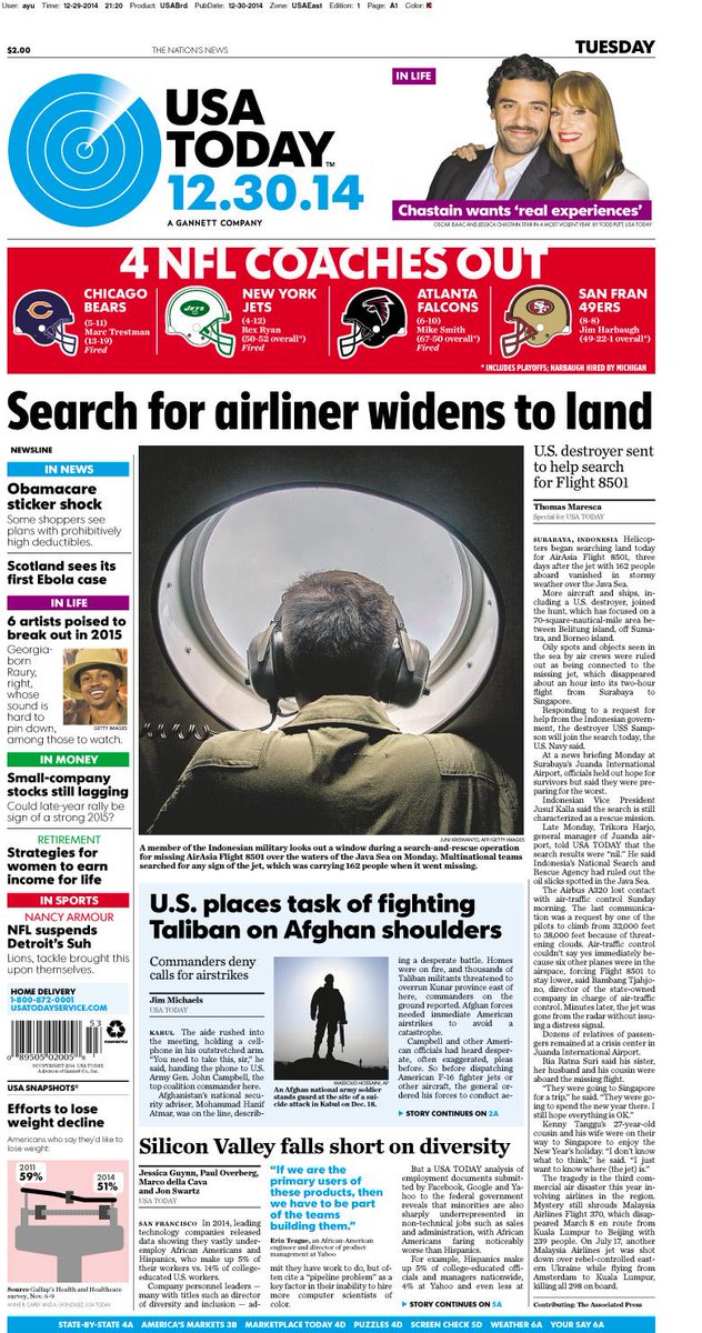 Today's #frontpage: #AirAsia search expands to land. Firing day at #NFL. Afghans now lead fight against Taliban.pic.twitter.com/QFSvv4w7q6