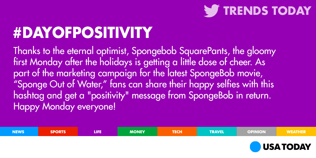 Mondays are the best … according to SpongeBob. #DayofPositivity http://usat.ly/1AxvSPu pic.twitter.com/TcSjMwfLay