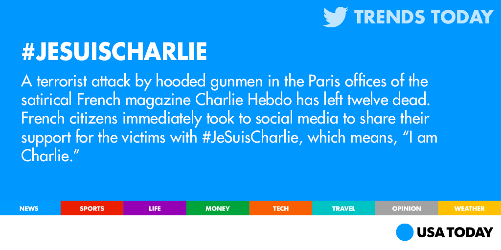 @USATODAY: Twitter is flooded with#JeSuisCharlie after the attack at#CharlieHebdo. http://usat.ly/1BMTwFS pic.twitter.com/5KzXkVC2PS”