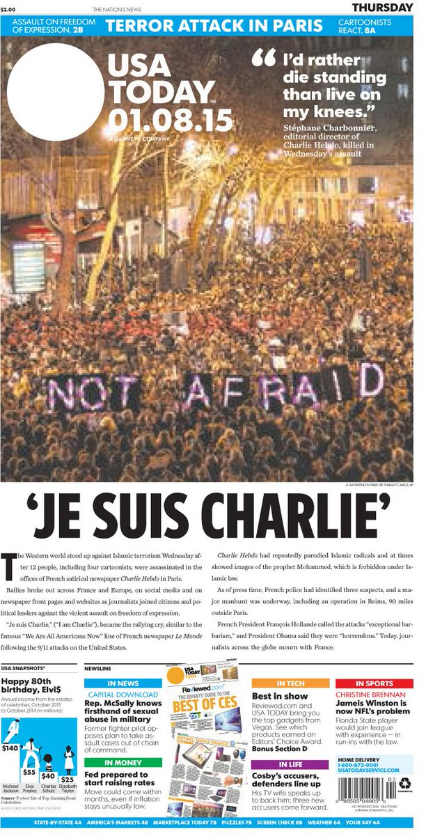"Je suis Charlie" en Une du très grand journal américain @USATODAY ce matinpic.twitter.com/X9QqymtVad
