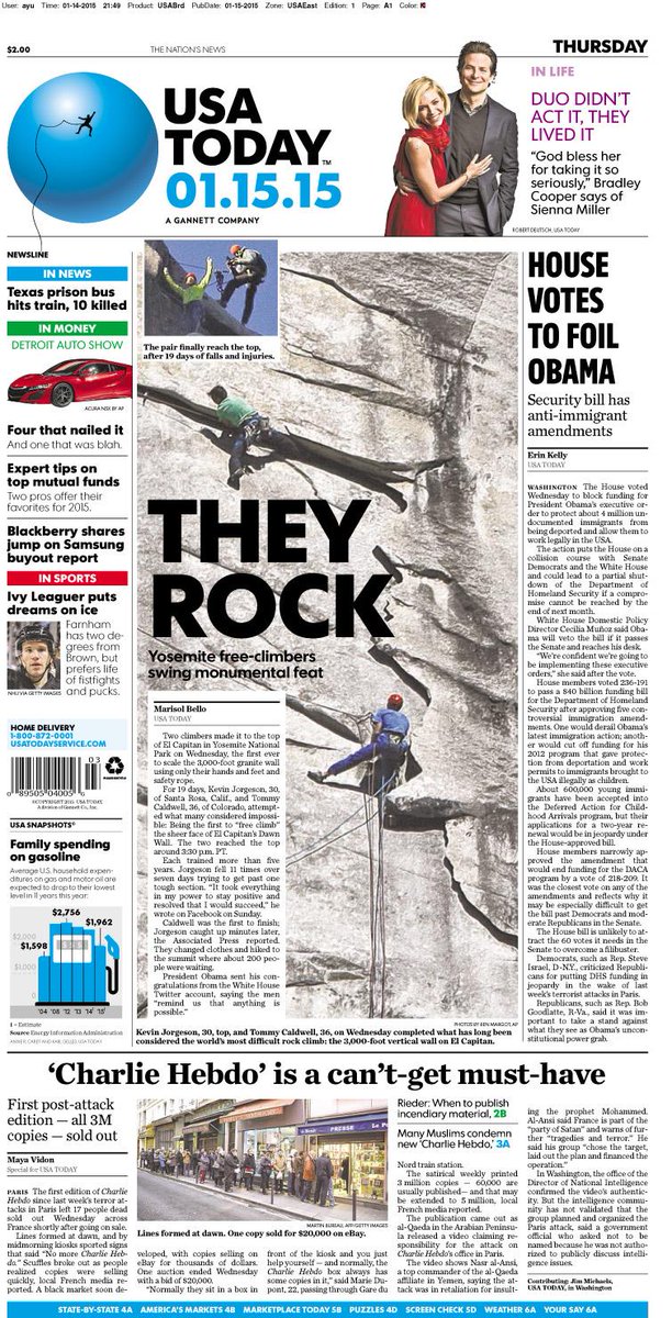 #SneakPeek at Thursday's front page: #Yosemite climbers achieve dream. 3 million copies of #CharlieHebdo sold out.pic.twitter.com/ghfVBP8Oep