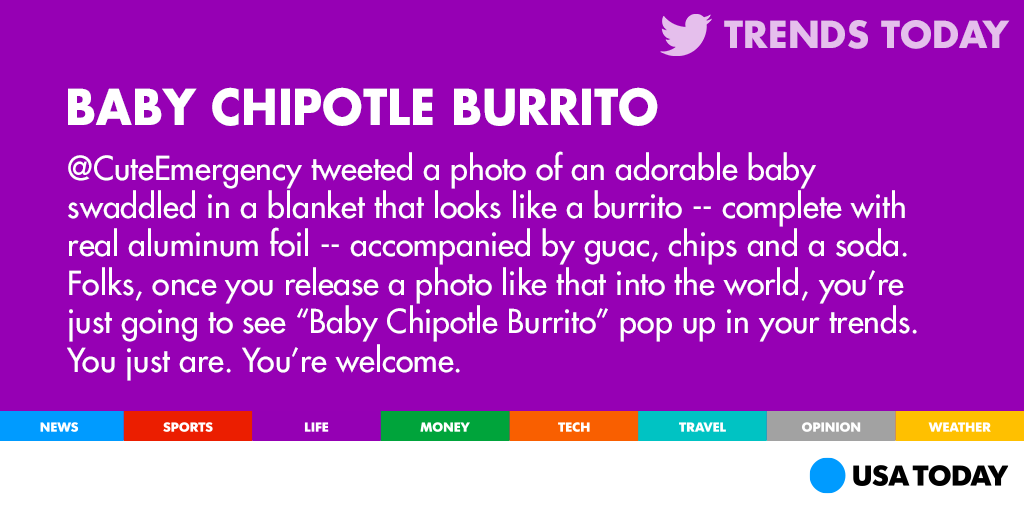 “@USATODAY: OMG, this Baby Chipotle Burrito is a @CuteEmergency. Just remember, guac is extra! And guac looks like baby poop! Perfect name.