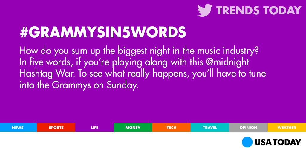 @USATODAY: How would you describe the#GrammysIn5Words? Play music I can understand!Thanks. Twitter will use this to make your timeline better. UndoUndo